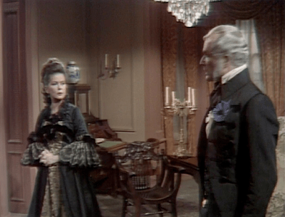 Vicki has already annoyed the audience several times by blurting out information that makes it obvious to the other characters that she does not belong in their world. She does that again in this scene. Barnabas is worried something may have happened to Josette, and Vicki tells him that she will arrive safely. He is surprised by the assurance with which she delivers this prediction, and asks if she is clairvoyant. She realizes that she has been indiscreet, and denies that she is. He is unconvinced.