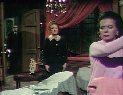 Julia enters, wearing a French maid outfit. She demands to know what Liz is doing. Since Barnabas knows Liz as the owner of Collinwood and Julia as a houseguest there, albeit one of unlimited tenure and an overpowering nature, her tone is as inexplicable as her attire. She orders Liz to leave the clothes alone. They argue about a person to whom they refer only as “she.” Liz says that “she” is dead, Julia insists that “she” will return. Liz wants to prepare the room for someone else’s use, Julia declares that only “she” will ever possess it.
