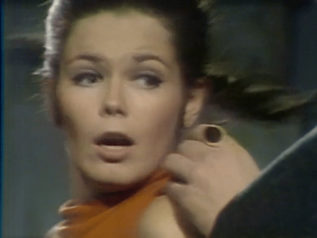 When Burke was played by Mitch Ryan, he was a great kisser, a talent he displayed with Vicki among others. But Anthony George does not appear to have seen anyone kiss before he attempts it. As he points his lips at Alexandra Moltke Isles, she stiffens her neck, a move that may have suggested excitement if her partner were doing something recognizable as a sign of affection, but that in this context looks like she’s suffering from whiplash. After his first failed effort, he rests his head on her shoulder and looks miserable.