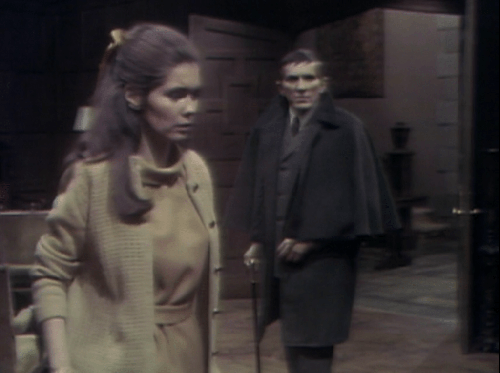 Carolyn has recently become Barnabas’ blood thrall, and is working to advance his goal of winning Vicki’s love. She goes to Barnabas in the Old House. She finds that mad scientist Julia Hoffman is with him. Barnabas dismisses Julia so that he and Carolyn can talk privately. She tells him that she saw Julia and Vicki take a walk earlier in the day. There was nothing unusual about that, but afterward she found that Vicki had no memory of the walk. When she asked Julia about it, she lied to her. Barnabas realizes that Julia, who has extraordinary abilities as a hypnotist, is working to undermine his chances with Vicki. He declares that Julia may have signed her own death certificate.