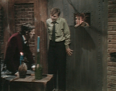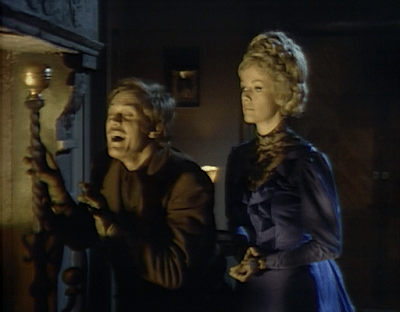 While Barnabas is talking with Angelique, Pansy is on Quentin duty. She decides to keep him awake by compelling him to join in a performance of her song. A record of this song, performed by Nancy Barrett and David Selby, hit the stores the very day this episode was first broadcast, so this is product placement. But Pansy is doing exactly what she would do in this situation, Quentin is reacting just as he would react, and it is a charming moment.