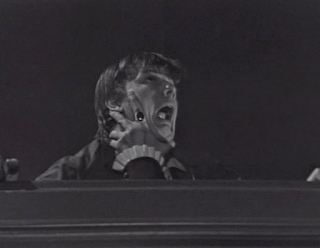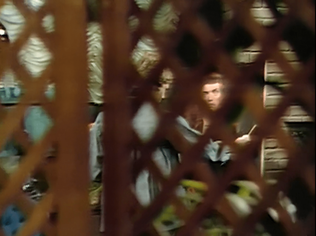 Swift was a talented and ambitious visual artist, Kaplan a sloppy and unimaginative one. He relied heavily on closeups. When it dawned on him that it was dull to hold the frame just beyond the edges of an actor’s face, his response was to zoom in and give us an extreme closeup of some part of the actor’s face. It’s above average for him that the first shot above includes Miss Barrett’s eyes- he specialized in shots displaying the face from the nostrils down, and often held them even after the actors had to move, leaving us with the sight of an ear drifting out of our view.