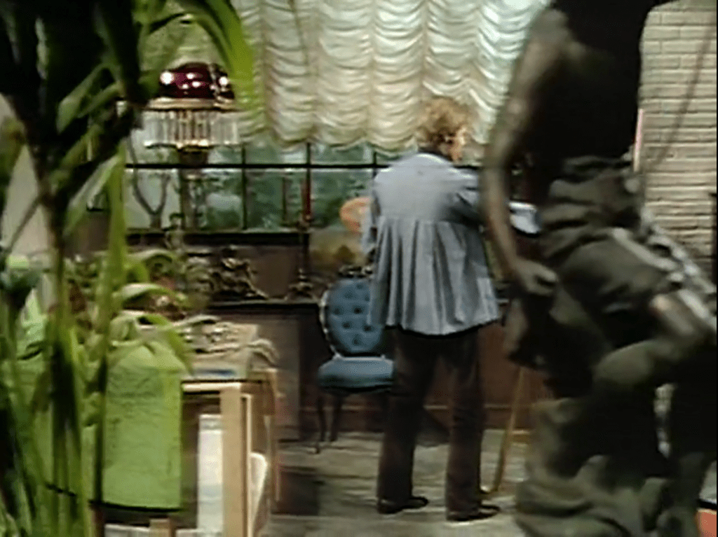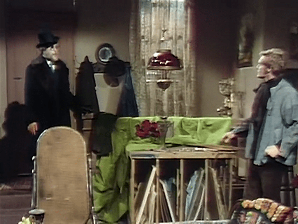 Julia bought a painting from the Todds the other day, and now they have received a telegram offering to buy it regardless of price. Julia goes to their shop and discusses the telegram with them. She believes that the telegram, which is signed “Corey,” may actually be from Quentin Collins, a distant cousin of Barnabas’ whom he befriended during his time in 1897 and who may have been immortalized by a magical portrait painted by the same artist responsible for the picture Julia bought. She tells the Todds that she is not certain she wants to part with the painting, but that she would very much like to meet “Mr Corey,” and that she believes others in town would also like to do so. She urges them to reply to the telegram with an invitation.