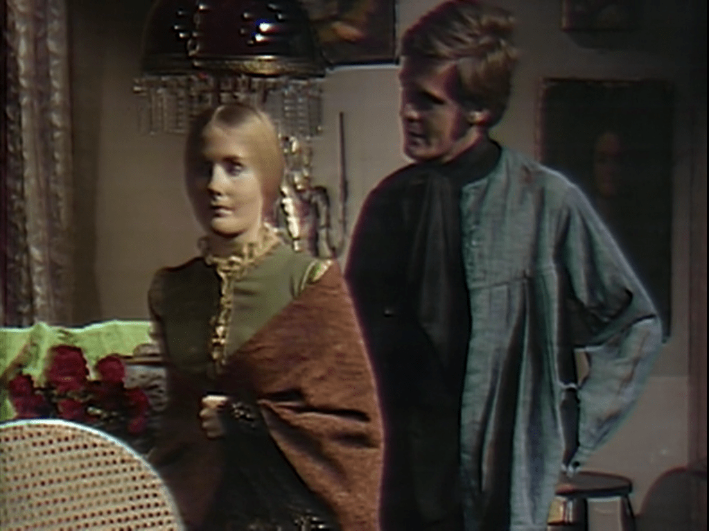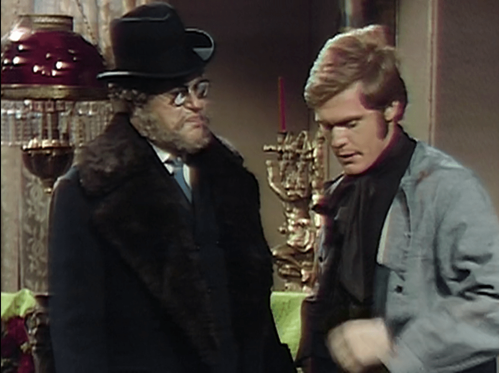 The current story centers on a mysterious cult that has sent time traveler Barnabas Collins back to 1969 from a long sojourn in 1897, by way of a couple of days in 1796. Under the influence of the cult, Barnabas is being a real jerk to his friend, mad scientist Julia Hoffman. Barnabas was a vampire for a long time, and even when he is free of the effects of that curse he habitually resorts to murder to solve his problems. But the victims of those murders are imaginary, played by actors who will go on to find other work, so we don’t usually stay mad at him for any length of time when he commits them. His friendship with Julia, on the other hand, is the emotional core of the show. Barnabas’ coldness to her in yesterday’s episode and today’s leads us to see what the cult is doing to him as the greatest crime anyone has ever committed on Dark Shadows.