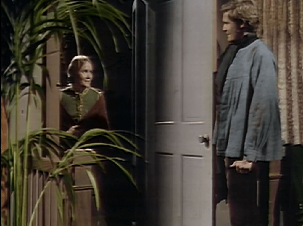 There is another flagrant Kaplanism in today’s first scene between antique shop owners Philip and Megan Todd (Christopher Bernau and Marie Wallace.) Philip enters from upstairs. He stops with his waist at the top of the frame. That’s where he stays for the first part of the scene, ending with Megan raising a paper that covers part of her face. Evidently what’s happening between the characters is none of the audience’s business.