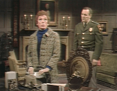 There is a wardrobe malfunction in this one of a type that showed up several times in the first year of the show. When Carolyn makes her first entrance, she walks down the stairs in the foyer. At each step, Nancy Barrett’s chest thrusts into her sweater with results that would probably not have made it on the air had anyone from the ABC network’s office of Standards and Practices been watching the show. In the early days, they put the actresses into very form-fitting tops often enough that I thought they were challenging the audience to take an adult attitude towards female anatomy, and so I did my best to rise to that challenge by leaving it unremarked when we could see the exact shape of their breasts. But it’s a rare occurrence now, so I think we have to list it among production faults.