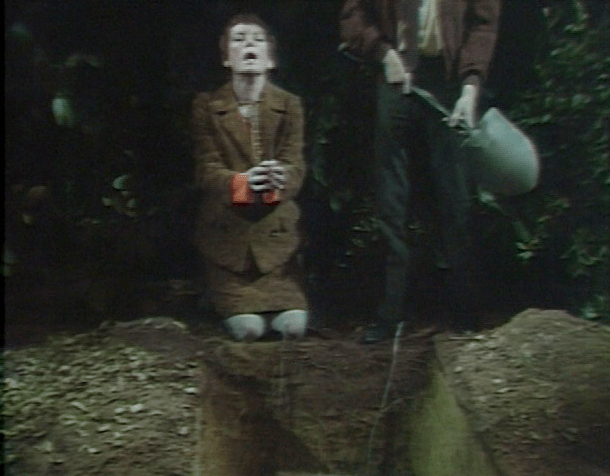 Once Willie has dug the grave and put Barnabas’ coffin in it, he and Julia decide to pray. She takes the lead, kneeling and throwing dirt, presumably including stones, onto the coffin. Dark Shadows avoided the topic of religion almost completely until repressed spinster Abigail Collins made her first appearance in #367; she and the Rev’d Mr Trask, introduced in #385, presented a wildly unfair, highly entertaining lampoon of eighteenth century New England Congregationalism. Recently the show has been lurching towards a vaguely friendly attitude towards Christianity. If Julia keeps strewing stones onto the grave once it is filled in, we might think that this friendliness extends to Judaism as well.